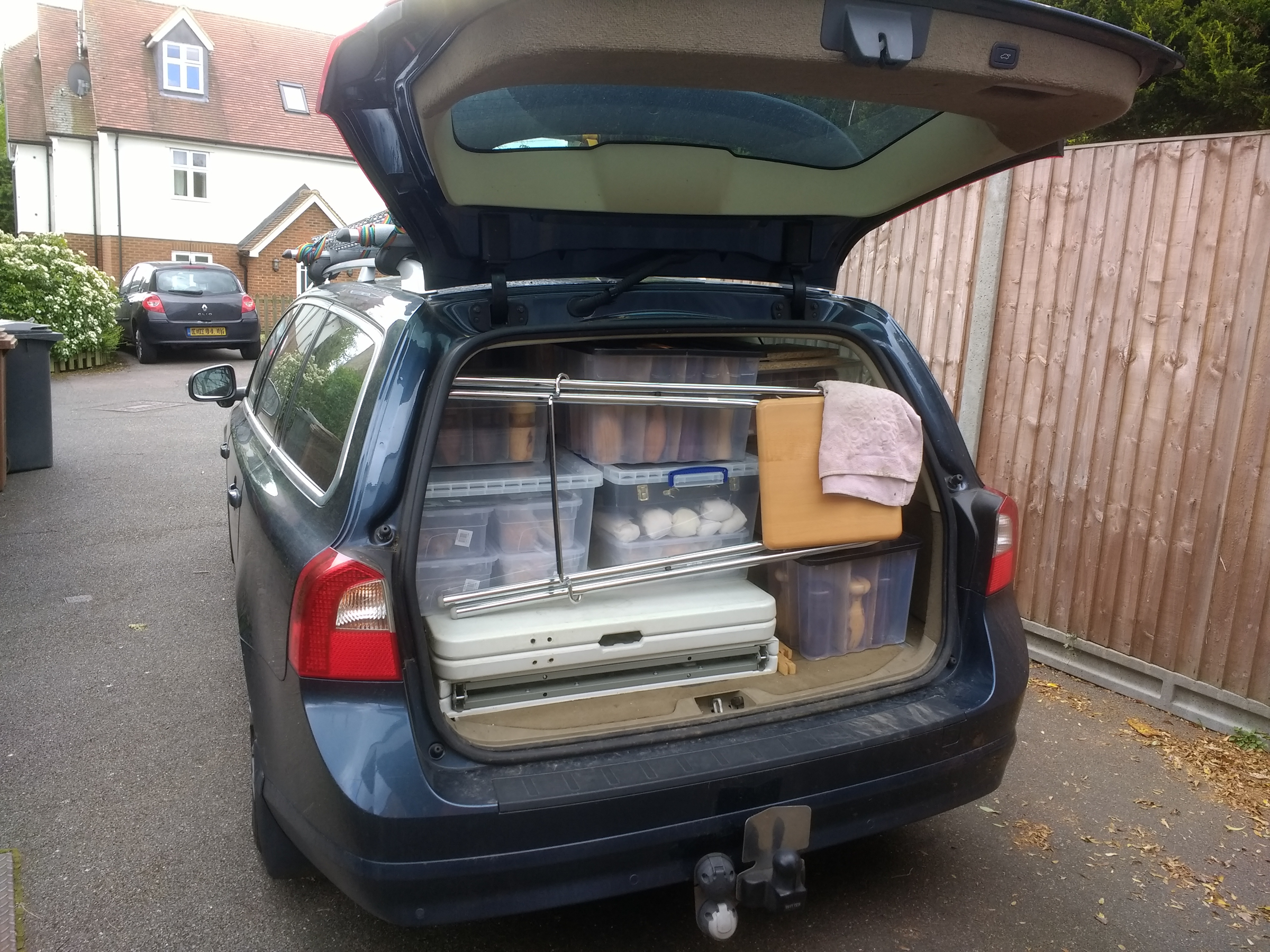 Well, I’ve burned as much midnight oil as I can to build up my stock and the moment of truth has arrived.  It’s now all boxed up and ready to go.  Alarm will be set for 4.00 am tomorrow for an early start to be at RHS Wisley by 6.00.  At least the M25 should be OK at that time of day!  Then all morning setting up ready for the fair opening on Thursday.  The only remaining question – will it all fit in the car?  It’s not just the stock (1st photo), but all the paraphernalia that goes with setting up the stall (2nd photo).
